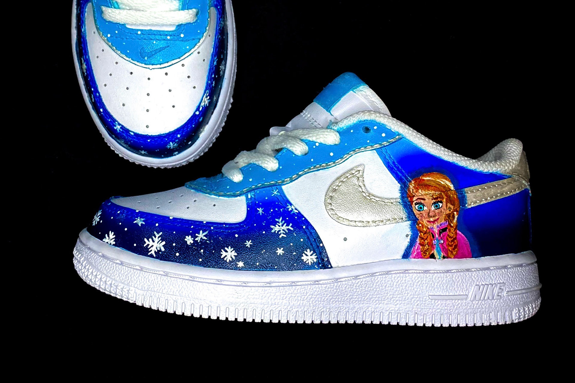 Ana and Elsa character shoes in Frozen theme with hidden Olaf